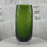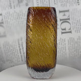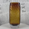A cylindrical glass vase with a deep bark-like etched texture across the body and a raw cracked clear glass base, available in warm amber and forest green.