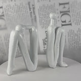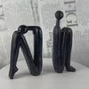A pair of abstract human figure sculptures that double as bookends — one bent forward in thought, one seated upright — in a speckled matte finish.