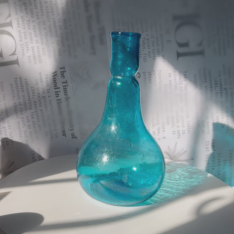 The Aegean Glass Vase draws inspiration from the calm blues of the Mediterranean coast. Handblown from transparent aqua glass, it features an elegant, rounded silhouette with a narrow neck — perfect for a single stem or as a standalone statement piece.
