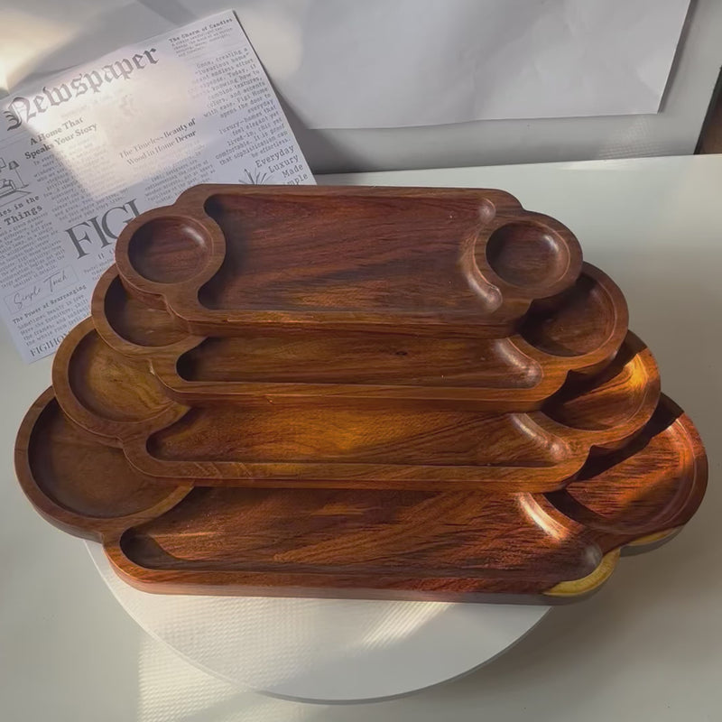 A handcrafted wooden serving tray designed with a refined balance of form and function. Featuring dual rounded side compartments and a spacious central surface, it’s perfect for serving snacks, dips, or creating elegant food presentations. Each piece highlights the natural grain and warmth of solid wood, making it both durable and decorative.