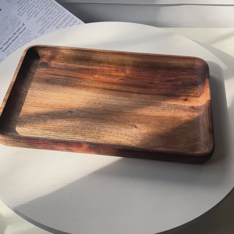 A beautifully crafted rectangular tray made from natural wood, featuring soft curves and a smooth, polished surface. Its warm grain and versatile size make it perfect for serving, organizing, or displaying décor with understated elegance.