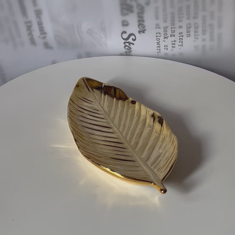 The Aurea Leaf Tray combines natural inspiration with luxurious design. Crafted in the shape of a delicate leaf, this elegant piece features a radiant gold finish that reflects light beautifully, adding warmth and sophistication to any space.