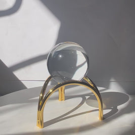 A spherical glass centerpiece balanced on a sculptural golden stand. Its reflective clarity and striking form create a captivating play of light, making it an elegant focal point for coffee tables, consoles, or modern shelving arrangements.