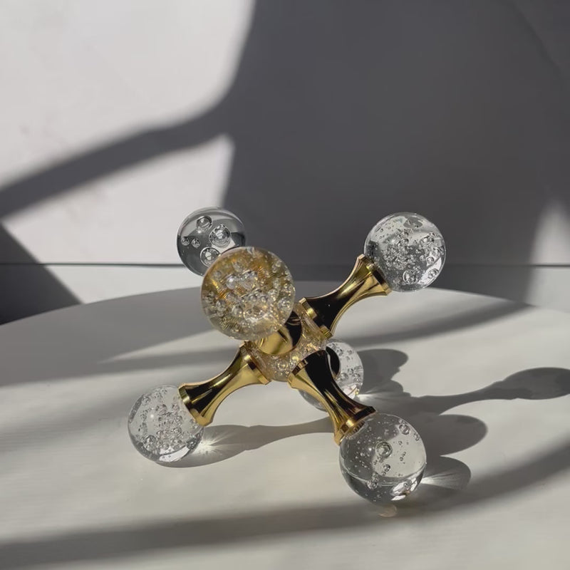 A striking decorative accent featuring six crystal-clear spheres infused with delicate bubble patterns, seamlessly joined by a golden metallic core. Its star-like geometry radiates elegance and modern sophistication, making it a standout statement piece for contemporary interiors. Perfect for display on shelves, coffee tables, or office desks.