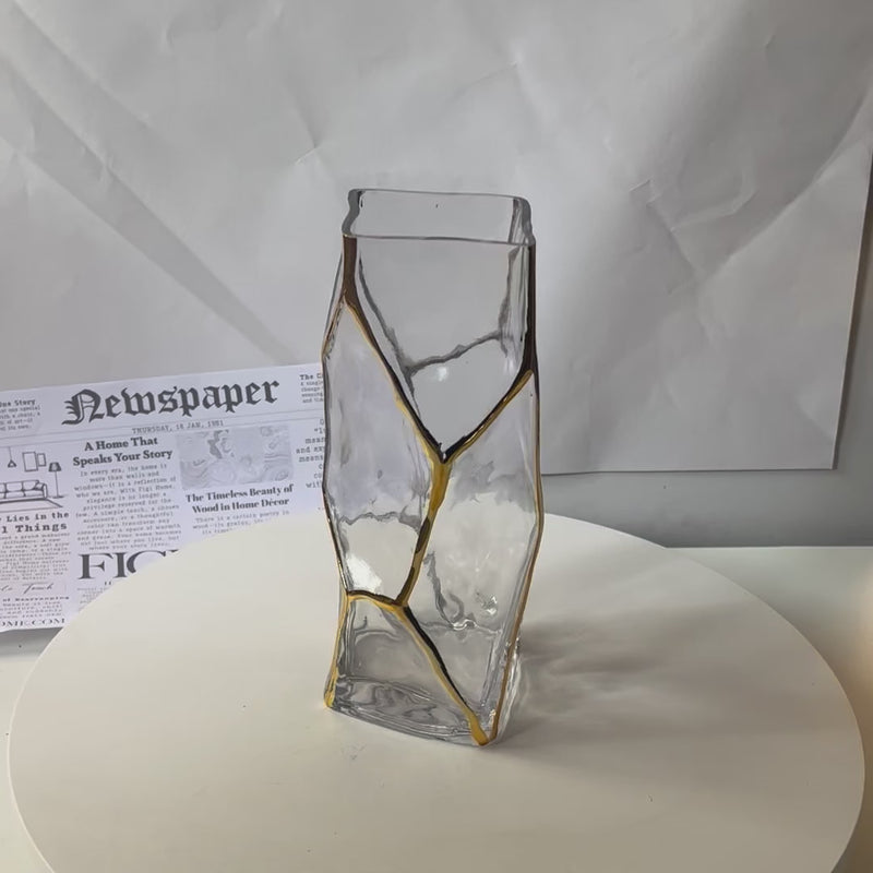 A striking hand-crafted glass vase defined by its sculptural, asymmetric form and bold gold-lined contours. The transparent body captures and refracts light, while the gilded edges create a refined contrast that exudes modern elegance. Perfect as a centerpiece or for displaying single long-stemmed flowers.