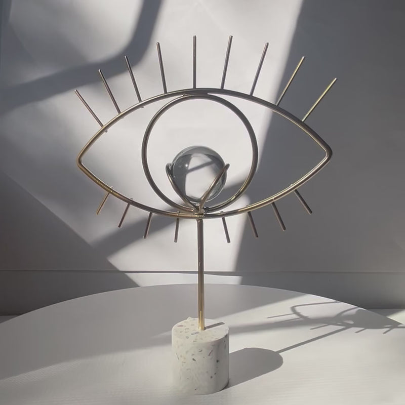 A striking decorative sculpture featuring a golden eye outline with radiating lashes, centered by a clear crystal sphere that catches and reflects the light. Mounted on a smooth marble base, this piece blends symbolism and elegance — representing clarity, protection, and refined taste.