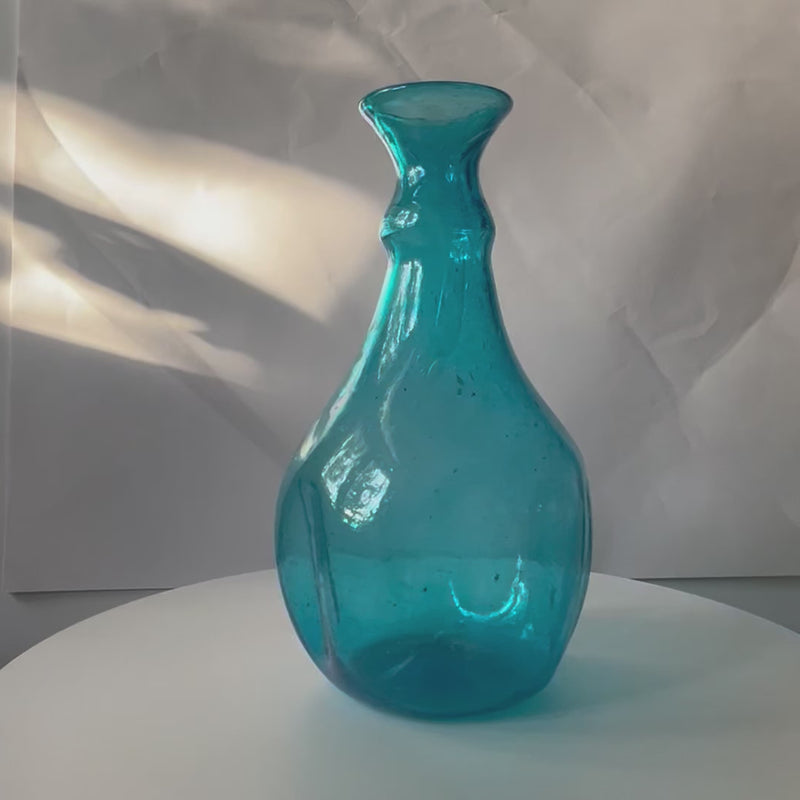A handblown glass vase with a gracefully cinched neck and softly rounded base. Its delicate bubbled texture and deep translucent hue add a sense of timeless craftsmanship, making it ideal for displaying fresh flowers or as a sculptural decorative accent.
