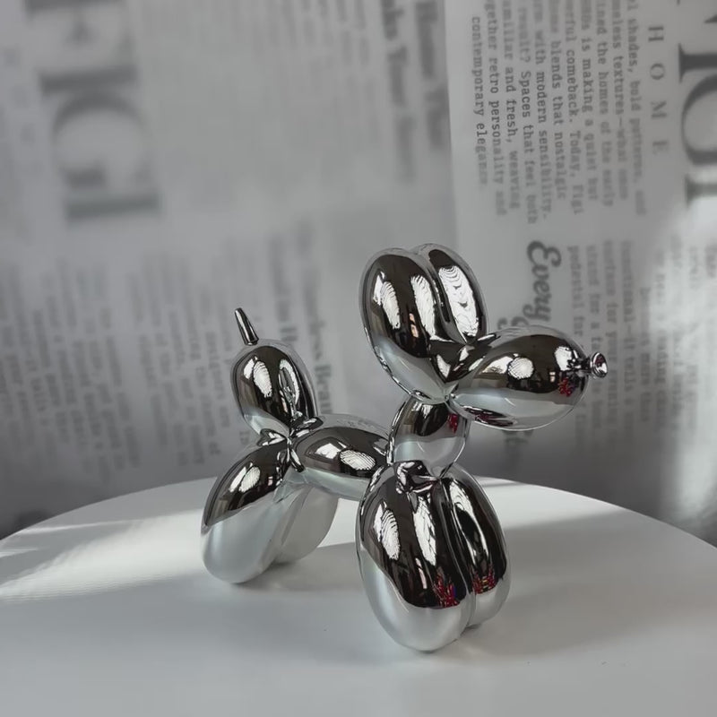 A glossy chrome decorative balloon dog sculpture — the iconic pop-art silhouette that never goes out of style. Its mirror-polished finish catches and bends light in every direction, shifting in tone depending on where it sits. Compact enough for a desk or vanity, bold enough to anchor a shelf or entryway console. Available in a range of finishes to match any interior palette.