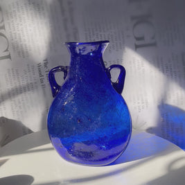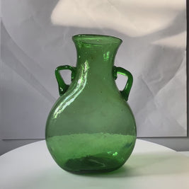 A handcrafted glass vase with a rounded body and twin side handles inspired by classic amphora forms. Its sculptural silhouette and smooth finish bring timeless charm to any space, whether styled with flowers, greenery, or displayed as a standalone accent.