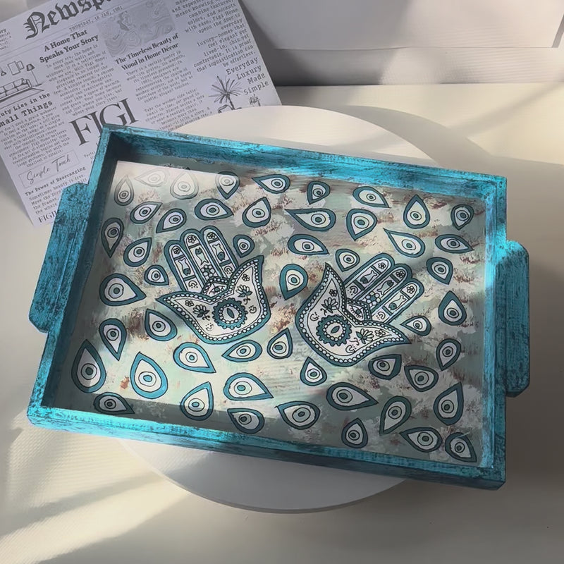A beautifully hand-painted wooden serving tray featuring twin Hamsa hands surrounded by protective eye motifs. Its deep blue distressed finish brings Mediterranean artistry and spiritual charm to your space.