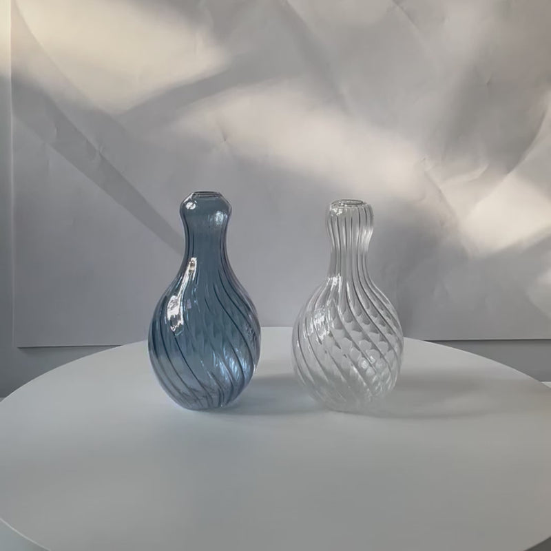 A handblown glass vase with swirl pattern and luminous transparency. Perfect for displaying single stems or as a sculptural accent on shelves and side tables.