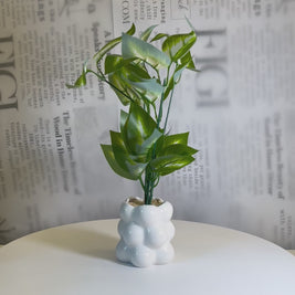 A playful yet modern decorative planter featuring a glossy porcelain bubble-shaped base paired with a tall artificial leafy plant. The soft sculptural form adds visual interest while the fresh green leaves bring height and life to any space without overwhelming it.