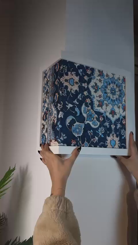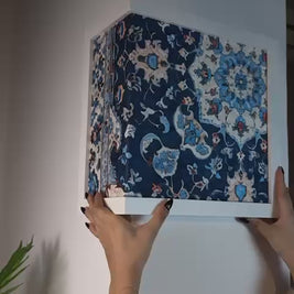 A distinctive corner wall art piece designed to fit perfectly around wall edges, turning corners into elegant focal points. The artwork features a rich blue floral pattern inspired by classic oriental motifs, adding depth and visual continuity across two walls.
