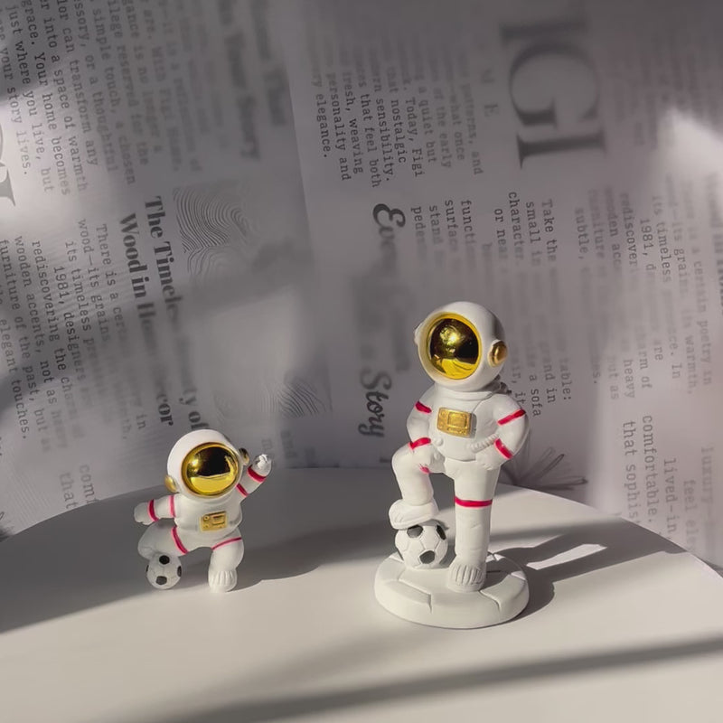 The Cosmic Kick Duo blends playfulness with futuristic design — two astronauts in white suits, mid-motion, ready for their interstellar football match. Each piece captures a joyful spirit with its sleek white finish, metallic gold helmet, and detailed sculpting that brings the figures to life.