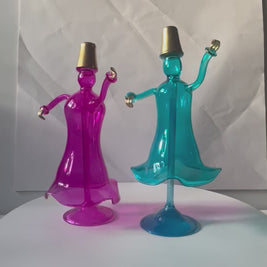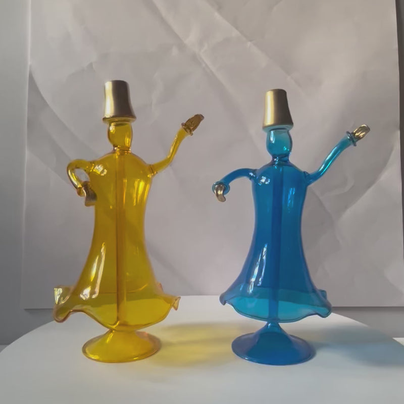 A handblown glass figurine inspired by the graceful motion of whirling dervishes. Sculpted in a flowing form with extended arms and a flared base, it is finished with golden accents on the hands and headpiece for a touch of elegance. Both artistic and symbolic, this piece makes a striking decorative accent for shelves, consoles, or tabletops.