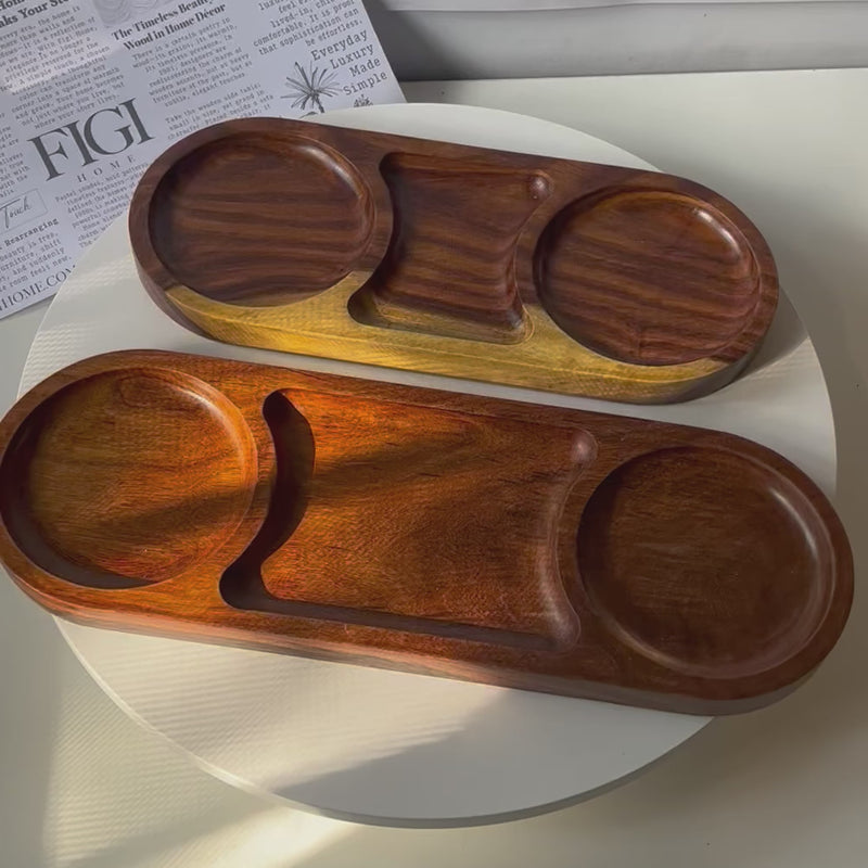 A set of handcrafted oval wooden trays, each featuring smooth circular compartments and a central section for versatile serving. With their polished finish and natural grain variations, they are perfect for presenting snacks, appetizers, or condiments in a refined and functional way. Designed to nest together for easy storage, they bring both elegance and practicality to any table setting.