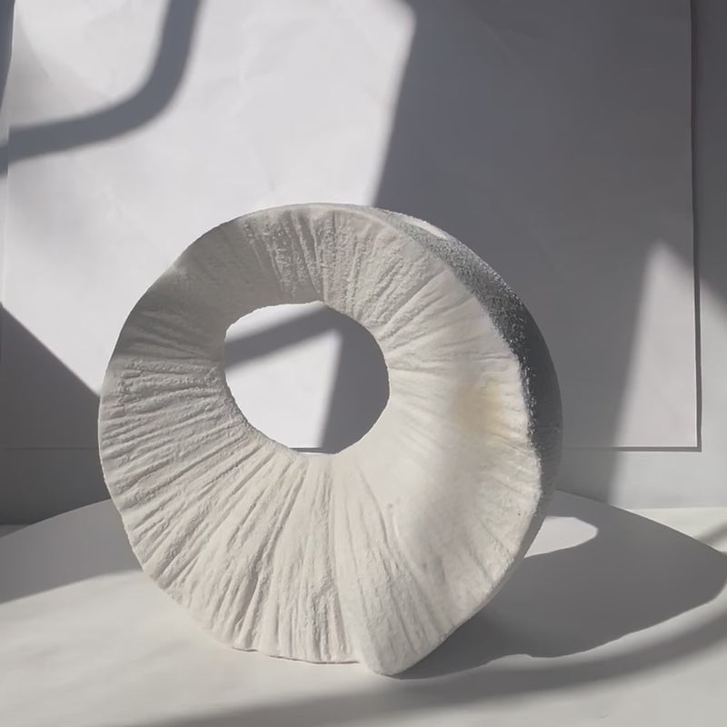 A contemporary ring-shaped sculpture with a textured, fabric-like surface that radiates a sense of movement and depth. Its organic circular form symbolizes unity and balance, making it a versatile centerpiece for consoles, coffee tables, or shelves.