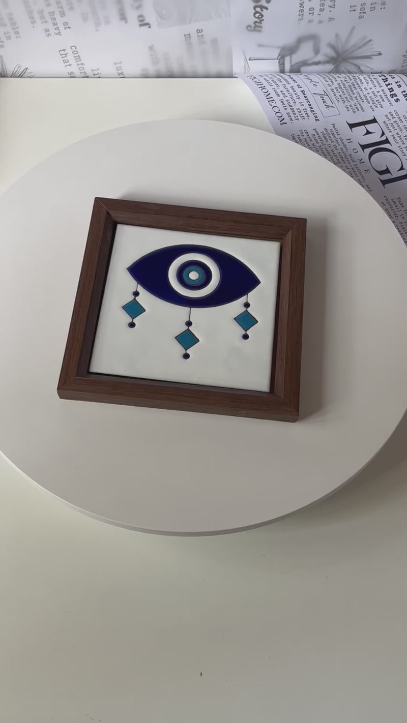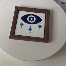 Symbolizing protection and blessing, the Ayn al-Baraka Frame features a modern interpretation of the traditional evil eye motif — a timeless emblem believed to ward off envy and attract positivity. Hand-glazed in rich shades of blue and turquoise, the design reflects Middle Eastern craftsmanship with a contemporary aesthetic. The deep walnut frame adds warmth and balance, making it ideal for modern or classic interiors.