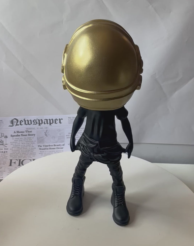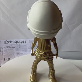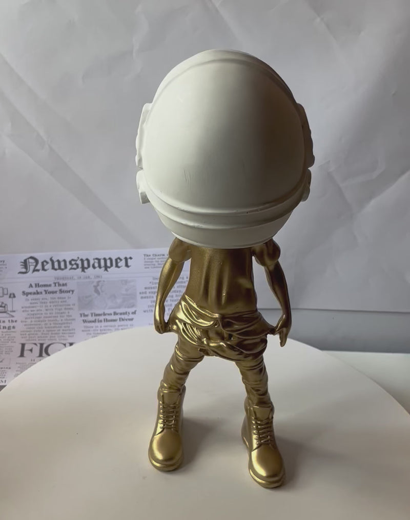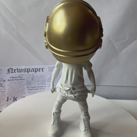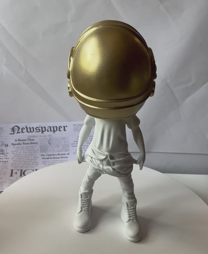 A modern art sculpture blending youthful energy with futuristic design. The Golden Astronaut Boy features a stylized figure dressed in streetwear with a metallic gold helmet, symbolizing curiosity, exploration, and creativity. Its white matte body contrasts beautifully with the gold sheen, making it a standout piece in any contemporary interior.