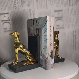 An elegant and refined bookend set featuring two sculptural greyhounds in a glossy gold finish. The slim, elongated form of the greyhound brings a sense of sophistication and movement, while the matte black bases provide stability and contrast. A perfect blend of luxury and modern décor, ideal for styling bookshelves, consoles, or office desks.