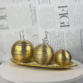 A trio of brushed gold porcelain spheres resting on a matching elongated tray — a simple composition that carries serious decorative weight. The hand-brushed metallic texture gives each ball a raw, artisanal quality that contrasts beautifully with the smooth tray beneath. A versatile styling piece for coffee tables, dining sideboards, or open shelving in any contemporary or glam interior.