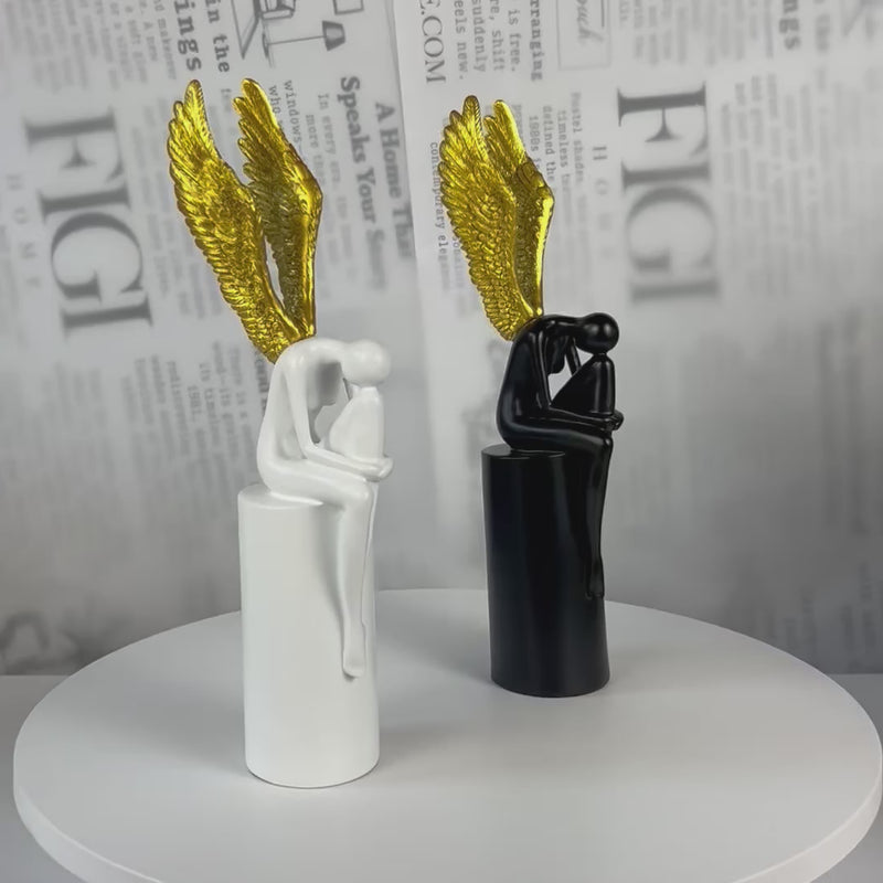 A graceful modern sculpture featuring a minimalist seated figure crowned with striking metallic gold wings. The contrast between the smooth matte white body and the radiant textured wings creates a powerful visual statement—symbolizing protection, hope, and inner peace.