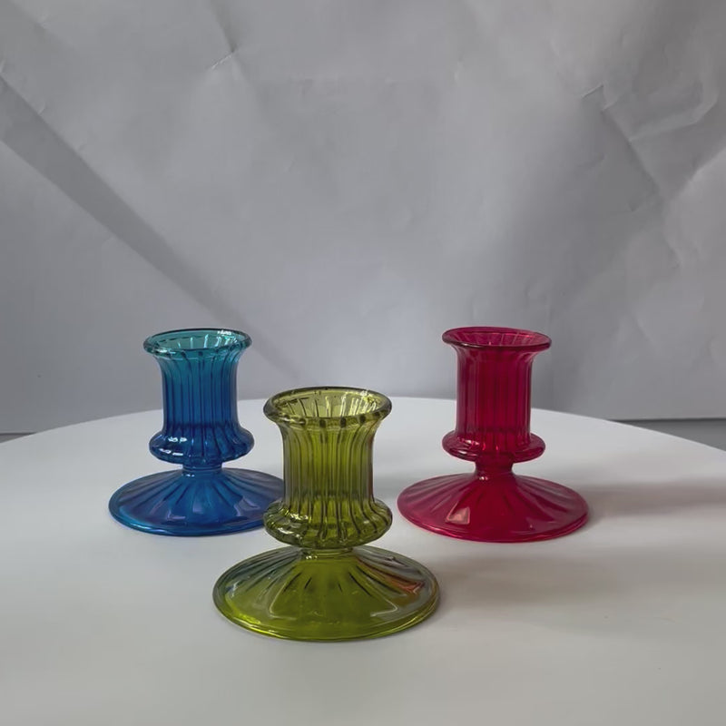 A handcrafted glass candle holder with a timeless ribbed design and sculpted curves. Its compact form makes it a versatile piece for styling coffee tables, shelves, or dining settings. The translucent finish catches light beautifully, adding a refined glow to any space.