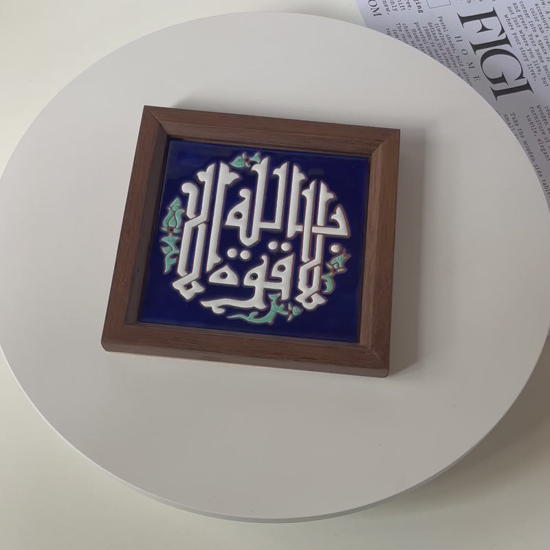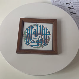 A timeless Arabic calligraphy piece capturing the sacred phrase “Lā Quwwata Illā Billāh” — “There is no power nor strength except through Allah.” This handcrafted ceramic frame symbolizes strength, faith, and resilience. The detailed calligraphy and turquoise floral flourishes are elegantly set in a rich walnut wood frame, merging spirituality with refined artistry.