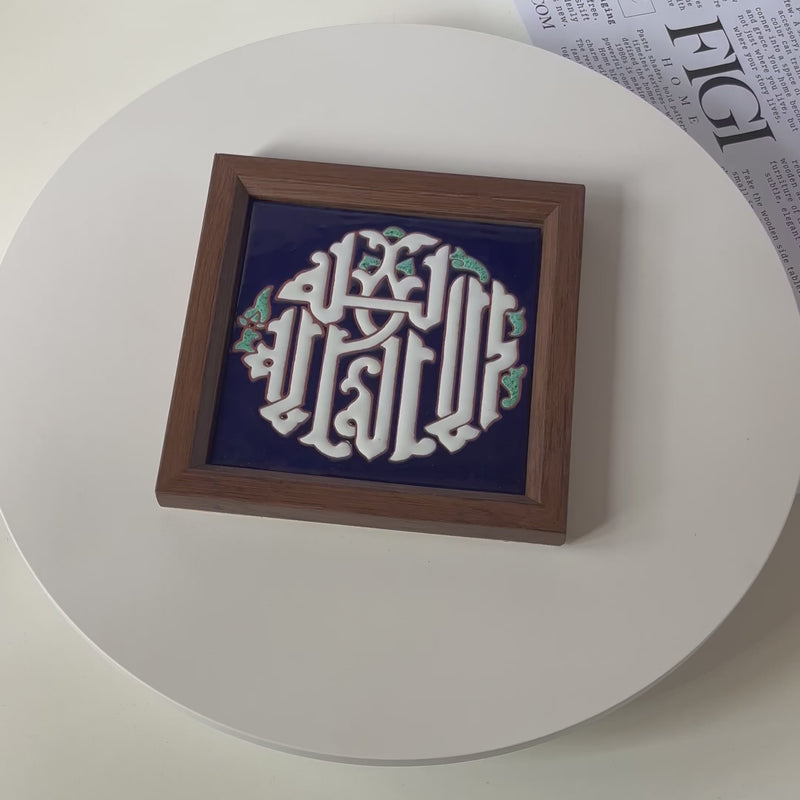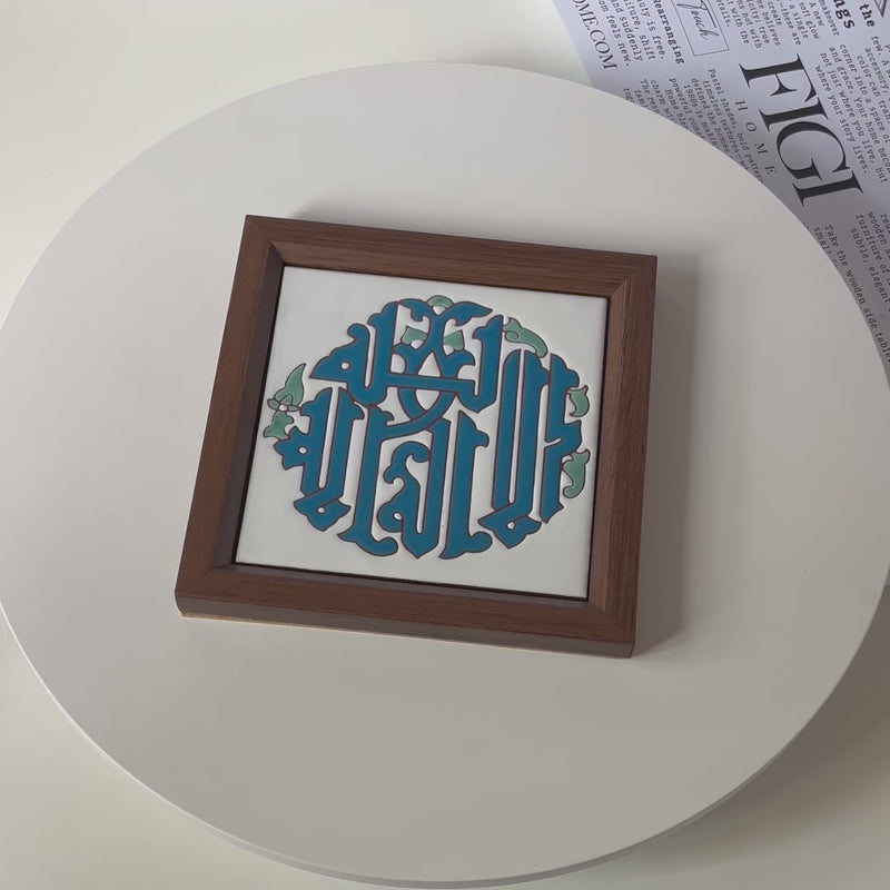 An elegant handcrafted ceramic frame featuring the sacred phrase “Lā Ilāha Illā Allāh”There is no God but Allah. The Kufic-inspired Arabic typography reflects timeless Islamic artistry, elevated with a refined, glossy finish and a rich walnut wood frame. This piece embodies faith and tranquility, making it a meaningful centerpiece for any interior.