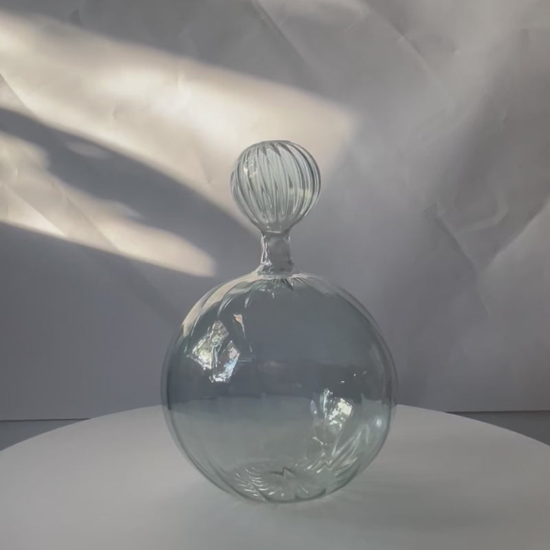 A handblown glass decanter with a luminous, globe-like body and a sculpted round stopper. Its iridescent finish and curved ribbing catch the light beautifully, making it both functional and decorative. Perfect for styling on a coffee table, sideboard, or as a striking standalone accent.