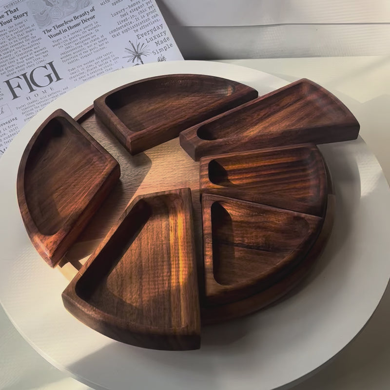 A round modular wooden platter featuring six removable sections, designed for elegant snack or appetizer presentation. Each compartment fits seamlessly into the circular base, offering both functionality and refined craftsmanship.