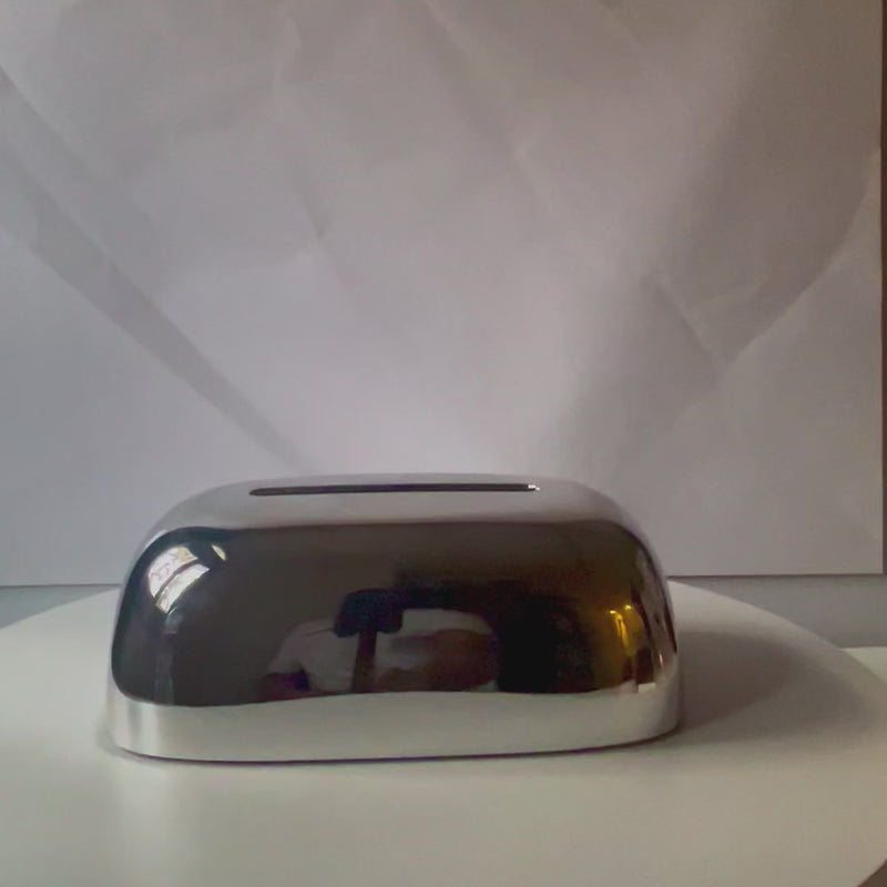A sleek tissue box holder with a minimalist chrome finish and smooth rounded edges. Designed to blend seamlessly into modern interiors, it adds a polished touch of elegance to coffee tables, nightstands, or office desks while keeping tissues easily accessible.
