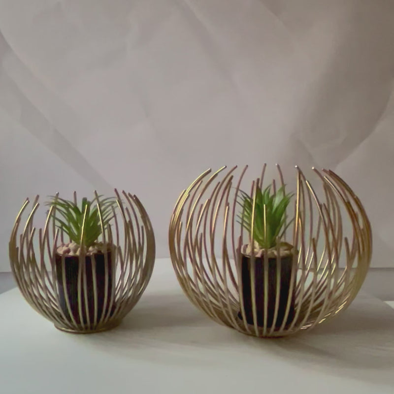 A contemporary decorative planter featuring a golden wireframe design that elegantly surrounds a small succulent in a matte black pot. Its artistic structure blends modern minimalism with natural greenery, making it a versatile accent for coffee tables, desks, or shelves.