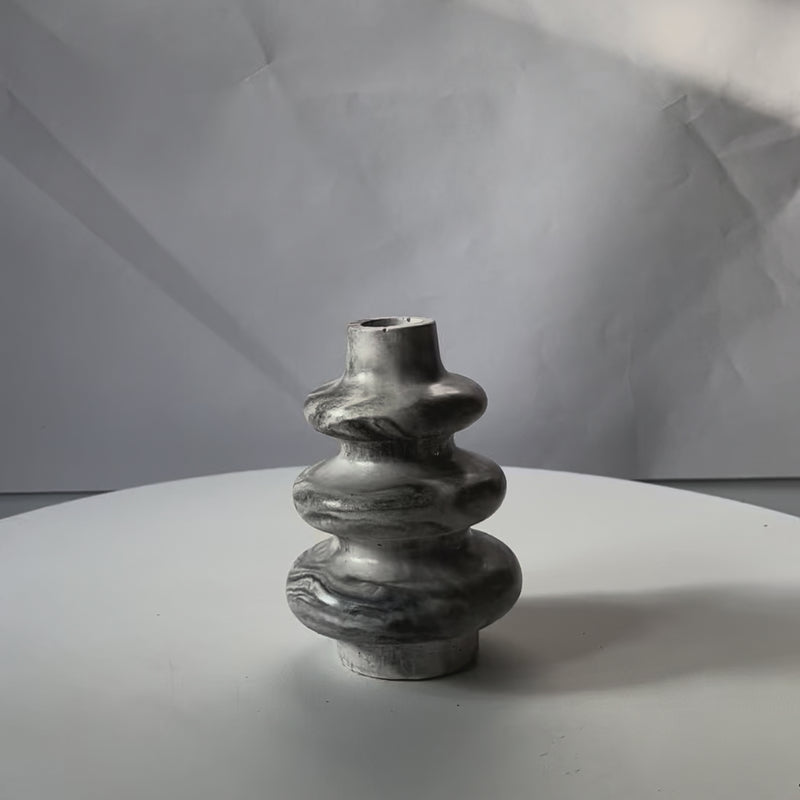 A sculptural vase crafted from premium lightweight fiber, featuring a distinctive tiered silhouette with soft marble-effect veining. Its artistic shape and stone-like finish make it a striking accent piece that blends modern design with organic charm. Perfect for showcasing dried stems or styled as a standalone decorative object.