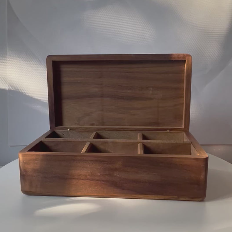 A handcrafted rectangular wooden organizer featuring four spacious compartments. Designed with a smooth matte finish and warm natural tones, it combines elegance and utility — ideal for tea storage, jewelry, or desk accessories.