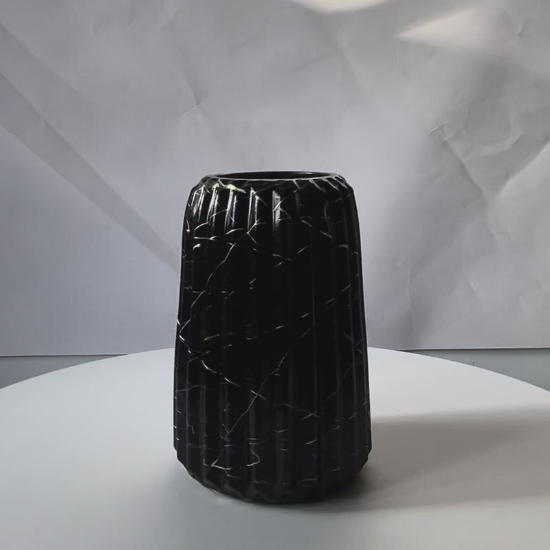 A contemporary statement piece crafted from durable fiber, designed to combine lightweight practicality with refined elegance. Its deep black body, enhanced by subtle golden veining, captures the sophistication of marble without the heaviness. The vertical ridged texture adds dimension and artistry, making it a versatile décor accent for modern and luxury-inspired spaces.