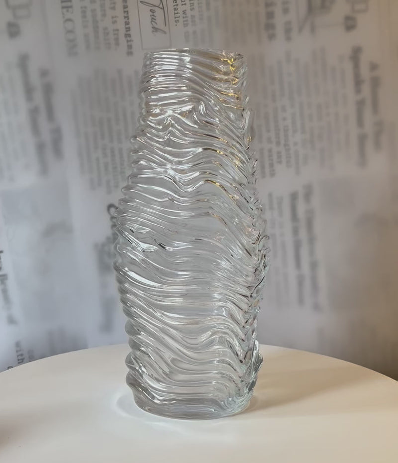 The Onyx Wave Vase is a sculptural masterpiece that combines artistic movement with modern elegance. Crafted from premium smoky glass, its fluid, wave-like texture creates a dynamic visual rhythm that captures and reflects light beautifully from every angle.