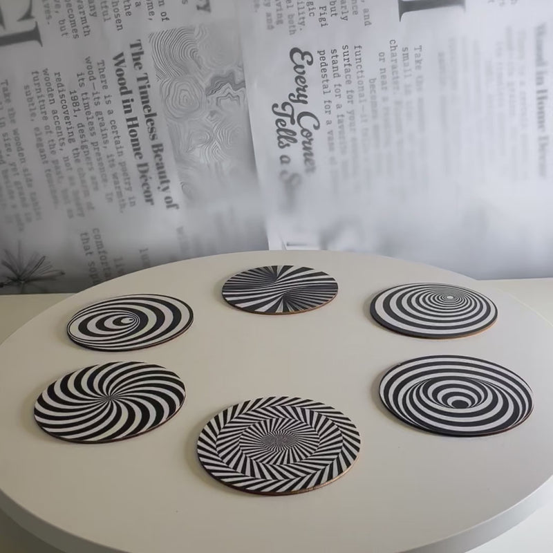This modern coaster set brings bold visual impact to your space with its striking black-and-white optical illusion patterns. Each coaster features a unique swirling geometric design that adds movement and depth to your table setup, making them both functional and artistic.