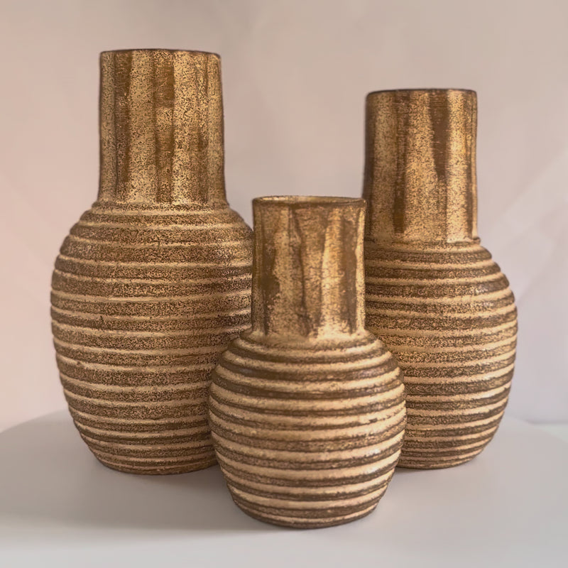 A handcrafted pottery trio inspired by earthy tones and natural textures. Each vase features a warm sandy glaze and a grooved surface that adds depth and character. Perfect for styling together as a set or individually for a minimal, rustic look.