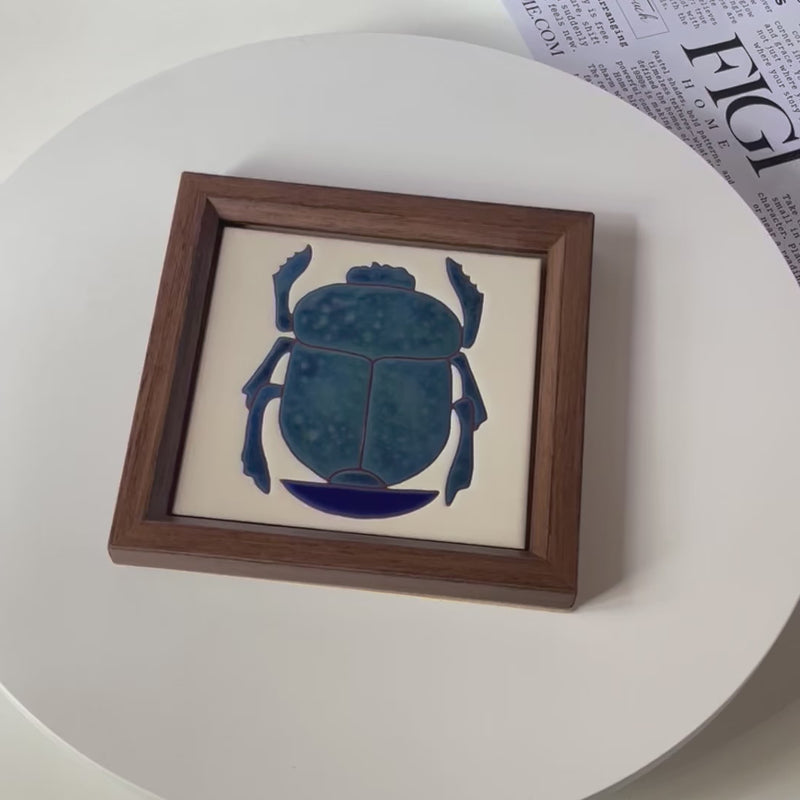 Inspired by the sacred Egyptian Scarab, symbolizing protection and rebirth, this handcrafted ceramic tile celebrates ancient artistry through a modern lens. Framed in rich walnut wood, the Scarab Tile Frame adds a meaningful and elegant touch to any interior — a perfect blend of heritage and contemporary design.