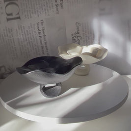 A modern decorative bowl with soft, flowing curves resting on a circular pedestal base. Its sculptural form creates a sense of movement and balance, making it a refined statement piece that adds depth and character to contemporary interiors.