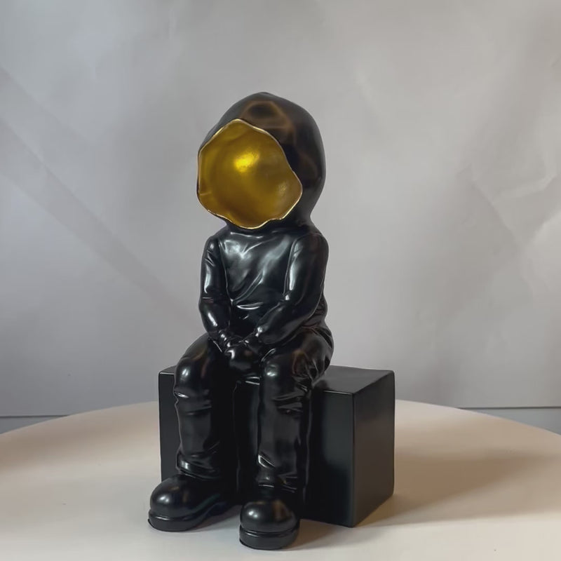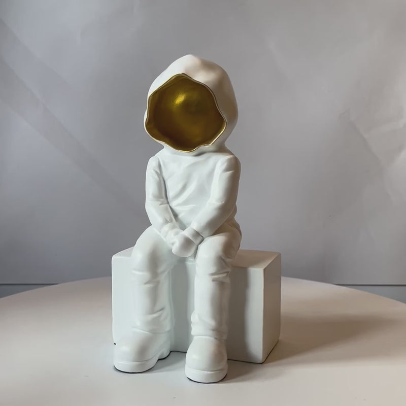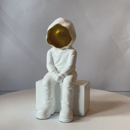 A modern minimalist piece that captures peace, mystery, and introspection. The Silent Dreamer Sculpture depicts a faceless hooded figure seated calmly, blending simplicity with emotion. Its matte white body and golden interior create a stunning contrast that adds warmth and depth to any space.