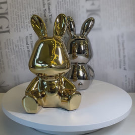 A playful decorative figurine with a smooth, rounded form and a reflective finish. Its relaxed sitting pose and glossy surface give it a modern, eye-catching look that stands out without overpowering the space.