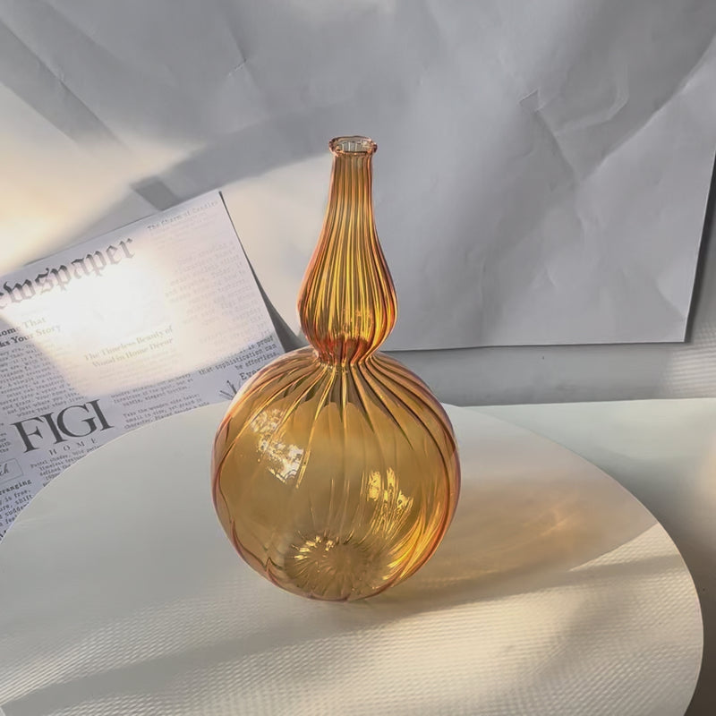 A striking ribbed glass vase with an elongated neck and sculptural form. Ideal for tall stems or displayed as a standalone statement, its timeless design makes it a versatile piece for both modern and classic interiors.