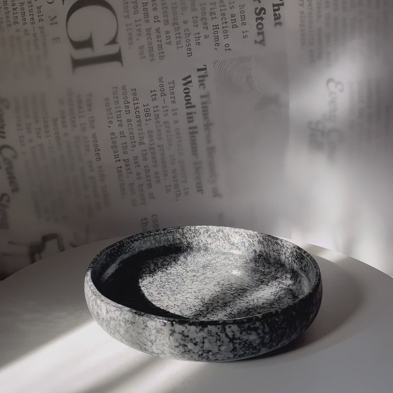 A shallow glazed clay bowl with a rich speckled finish that brings depth and character to any surface. Its wide, low-profile form makes it ideal for styling coffee tables, consoles, or dining spaces with a calm, modern feel.