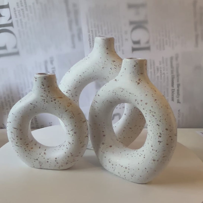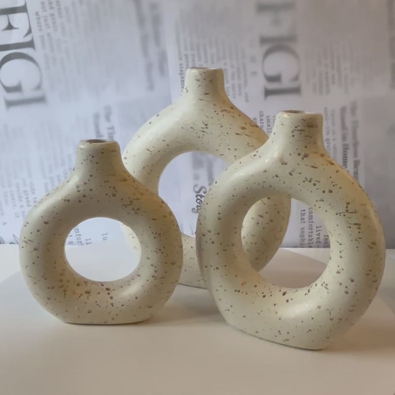 The Speckled Loop Vase Set blends modern minimalism with a handcrafted aesthetic. Each vase features a distinctive circular design with an open center — a symbol of balance and flow. The soft matte finish is beautifully accented with subtle golden speckles, adding a touch of understated luxury to any modern space.