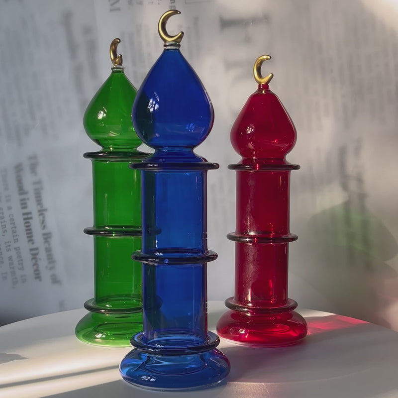 Inspired by the architecture of traditional minarets, the Tall Crescent Glass Ornament adds height and elegance to any display. Hand-crafted from richly tinted glass and crowned with a golden crescent moon, this piece captures the beauty of cultural symbolism through refined, modern craftsmanship.