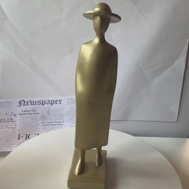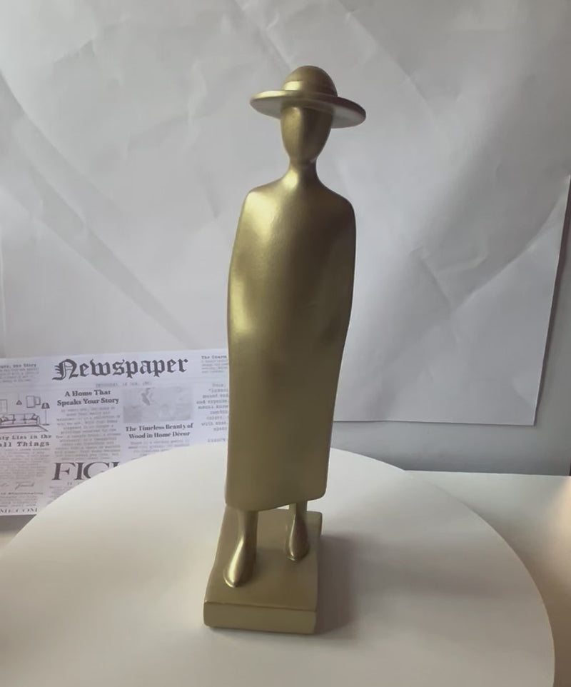 A minimalist and elegant sculpture symbolizing calm confidence and timeless style. The Golden Wanderer features a faceless figure in a long coat and wide-brimmed hat, crafted with smooth, clean lines that evoke a sense of mystery and sophistication. A refined piece that adds artistic depth to modern interiors.