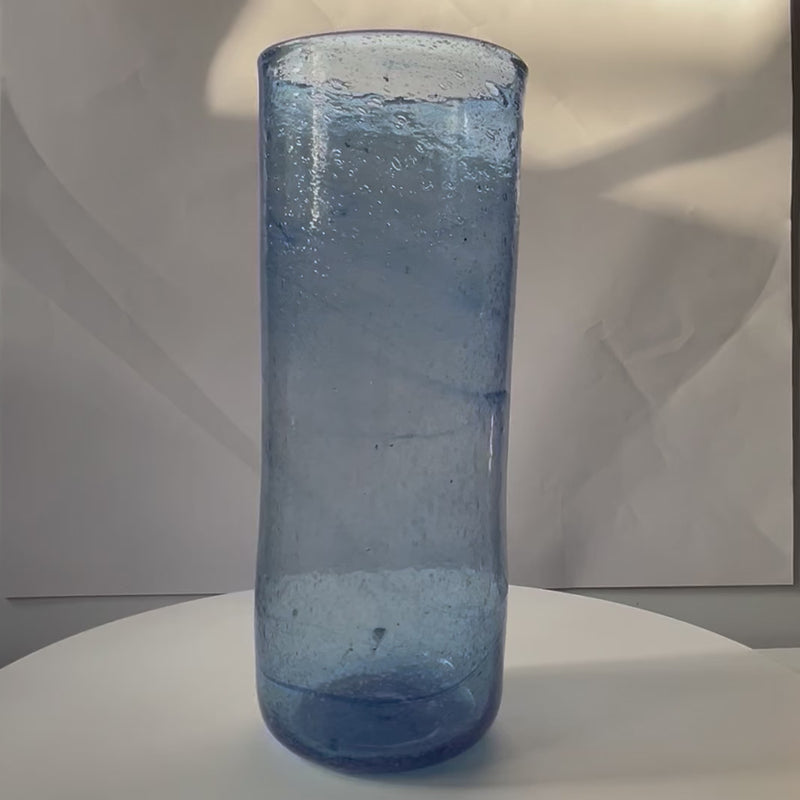 A cylindrical glass vase with a modern, minimalist appeal. Its clean lines and subtle texture make it versatile for displaying flowers, greenery, or simply as a refined decorative element on shelves, dining tables, or workspaces.