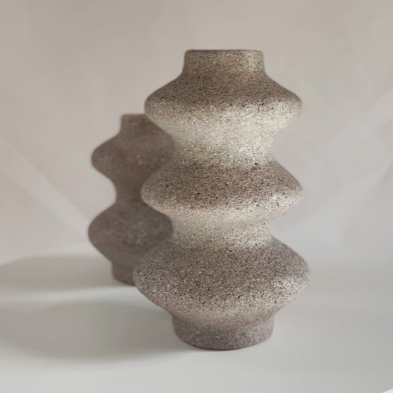 A modern handmade pottery set with a unique textured finish, inspired by natural volcanic stone. The organic curves and dark earthy tone make it a bold accent in any space. Sold as a set of two complementary shapes.